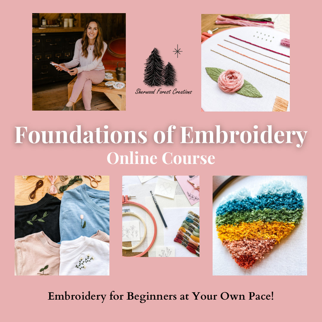 Again, these are quick tips BUT if you’re looking for full, in-depth embroidery tutorials you can join my Beginner Embroidery Course! You’ll learn all about proper materials, basic stitching skills, 11 different embroidery stitch types, and SO much more!
